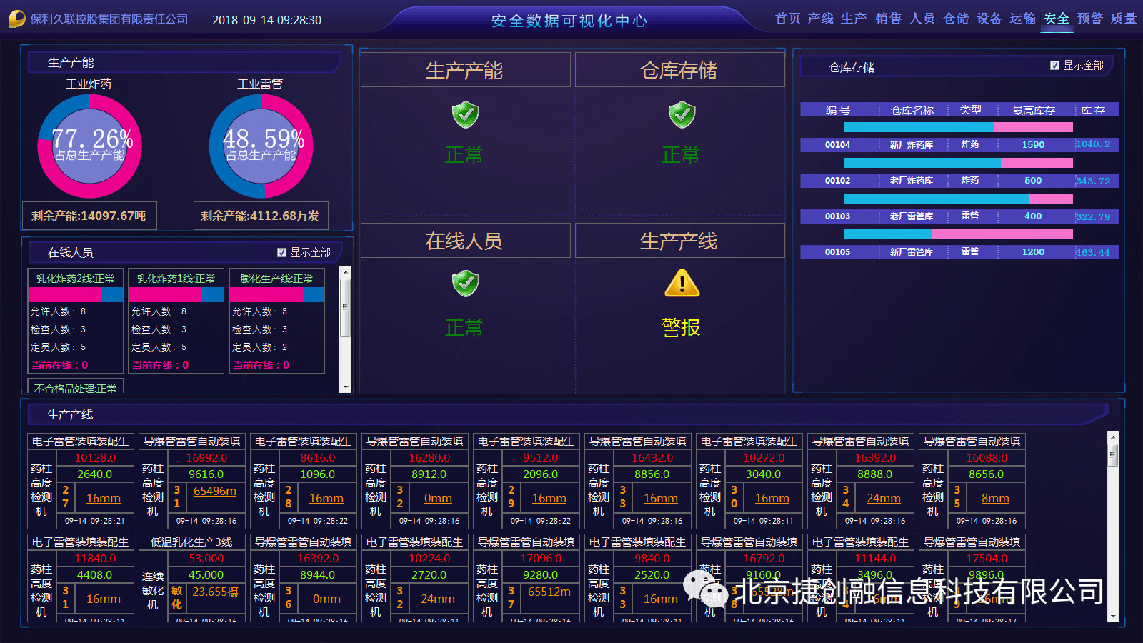 生產(chǎn)線可視化中心 智慧平臺的倉儲板塊綜合利用了工業(yè)視覺識別技術(shù)以及自動掃描技術(shù),對出入庫產(chǎn)品信息進行自動批量實時采集同時自動分析以及統(tǒng)計,極大的提高了倉儲數(shù)據(jù)的實時性,、準確性,有效減輕了庫管人員的工作強度;同時與公安民爆出入庫系統(tǒng)深度集成,減輕企業(yè)重復工作。通過以上應(yīng)用提高倉儲效率,降低倉儲成本,提升企業(yè)競爭力。